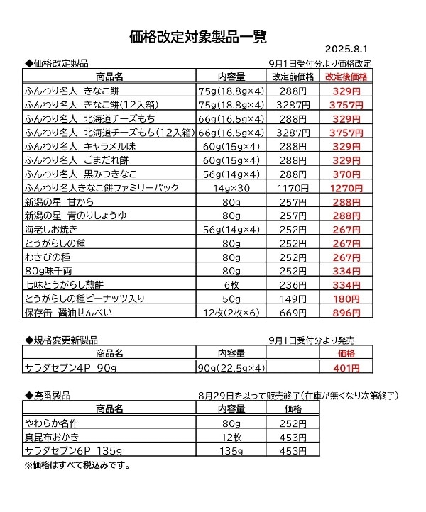 この度、2025年9月1日受付分より、一部米菓製品につきまして価格改定及び規格変更を実施